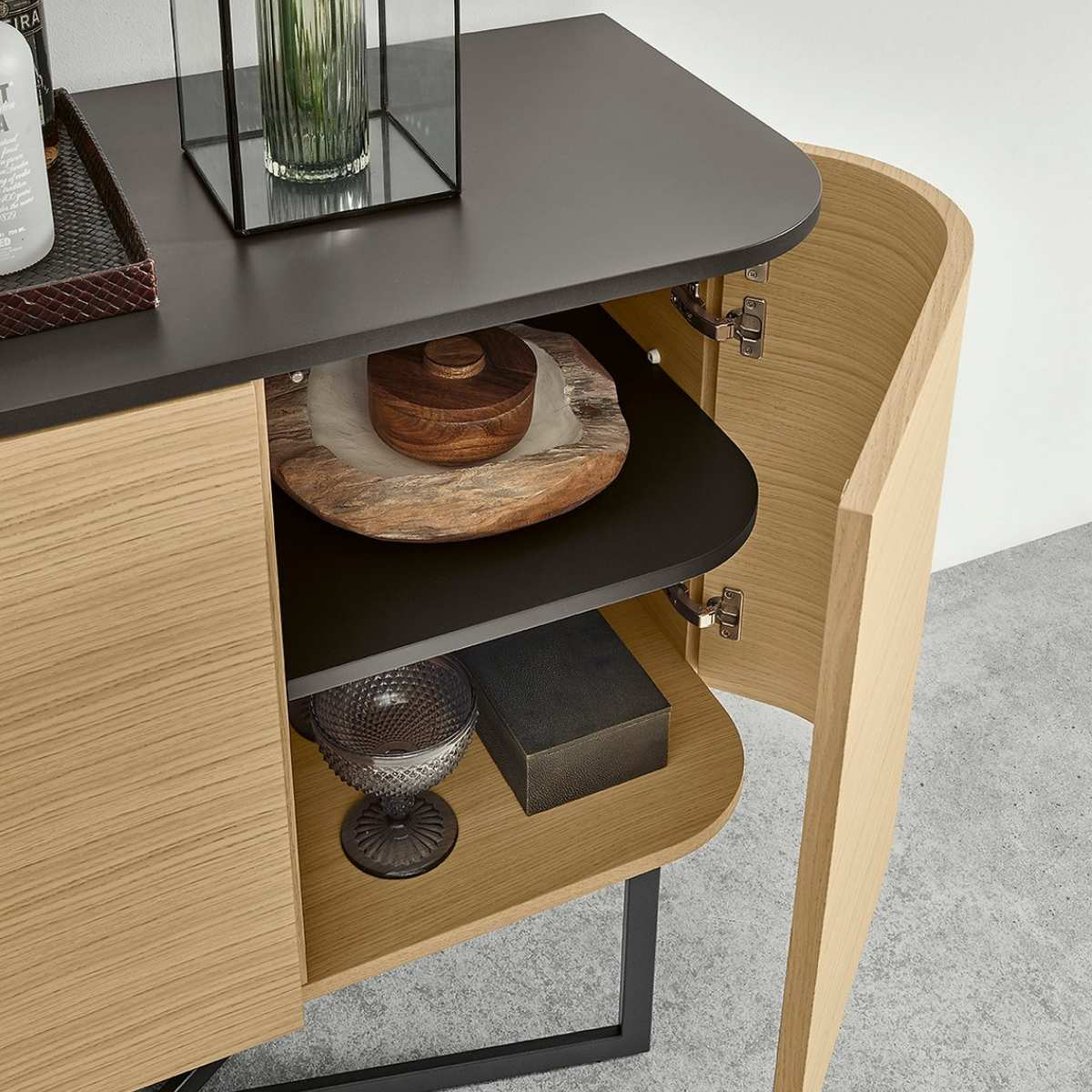 Acabamento: Pé em ferro, carvalho com lacado mate