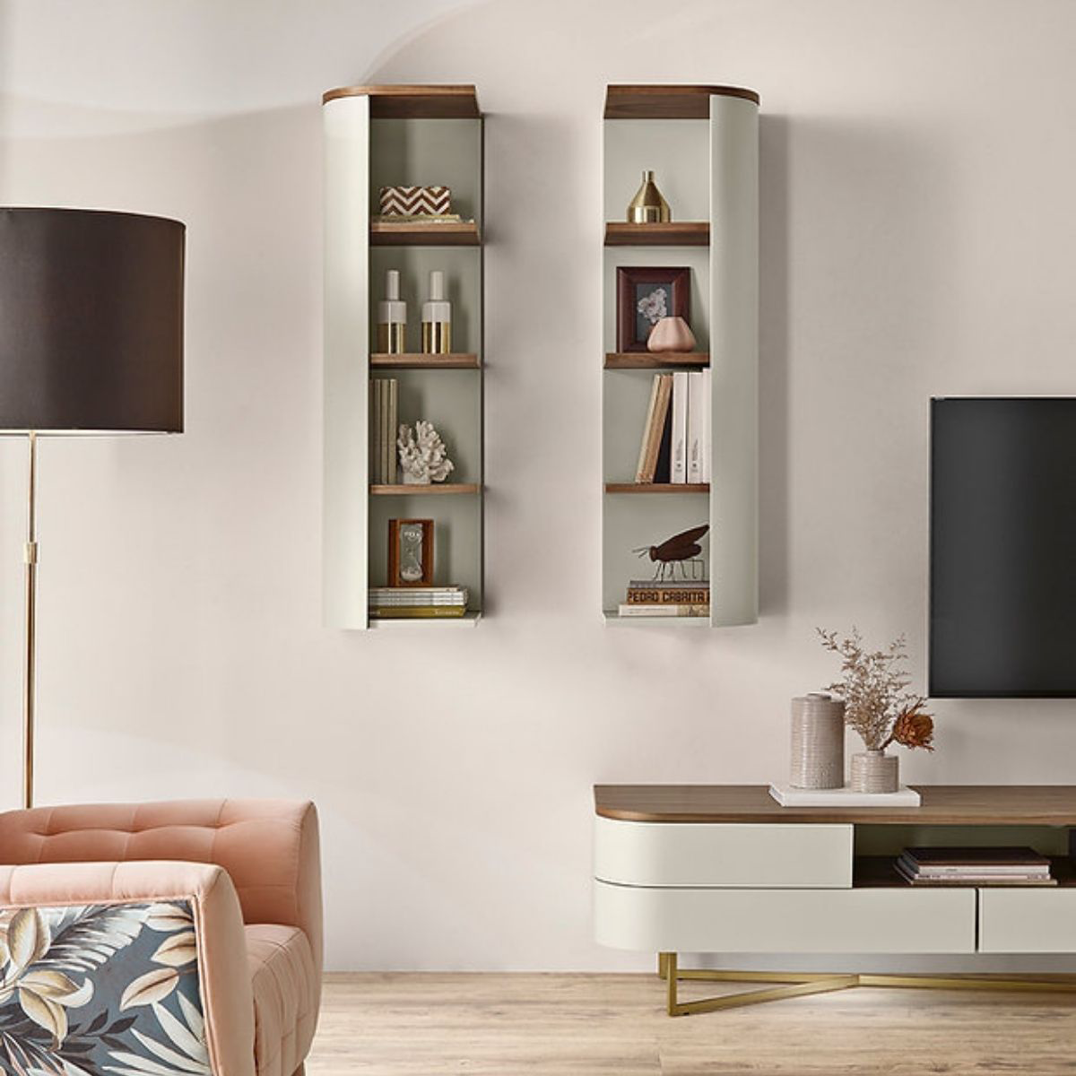 Estante composta por base tv e dois módulos suspensos