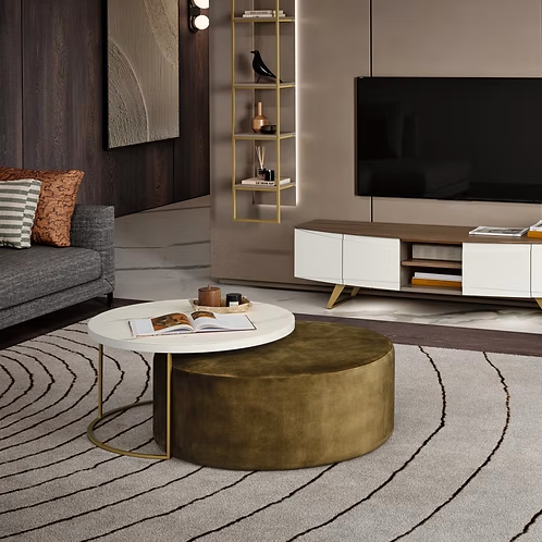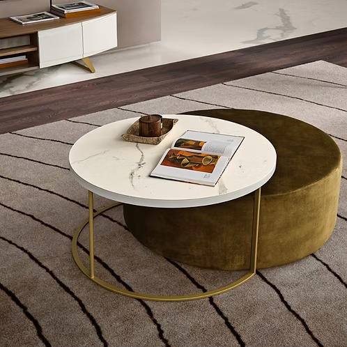 Adicione um pouco de personalidade e crie uma vibração urbana na decoração da sua casa com este conjunto de mesa de centro. Uma mesa em Lacado com cerâmica e pé de Ferro. E um puf estofado com um diâmetro de 100 cm.